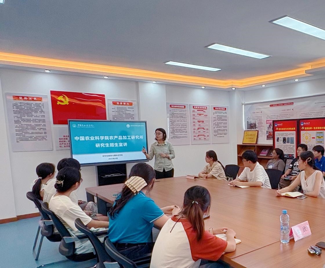 2025年9月8日下午,中国农业科学院研究生招生宣讲会(食品学院专场)在青山湖校区分测606会议室成功举办。本次宣讲会由中国农业科学院加工研究所研究生教育与国际合作处副处长卢嘉主讲,吸引了众多有报考意向的研究生参加。