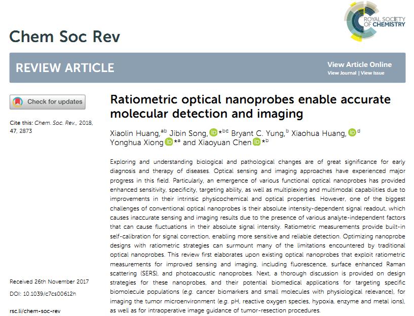 2018年3月23日,食品学院博士研究生黄小林以“Ratiometric optical nanoprobes enable accurate molecular detection and imaging”(比率型光学纳米探针精准分子检测和成像)为题,在国际化学化工领域顶级期刊Chemical Society Reviews(《化学学会评论》,IF=38.618)发表综述论文。