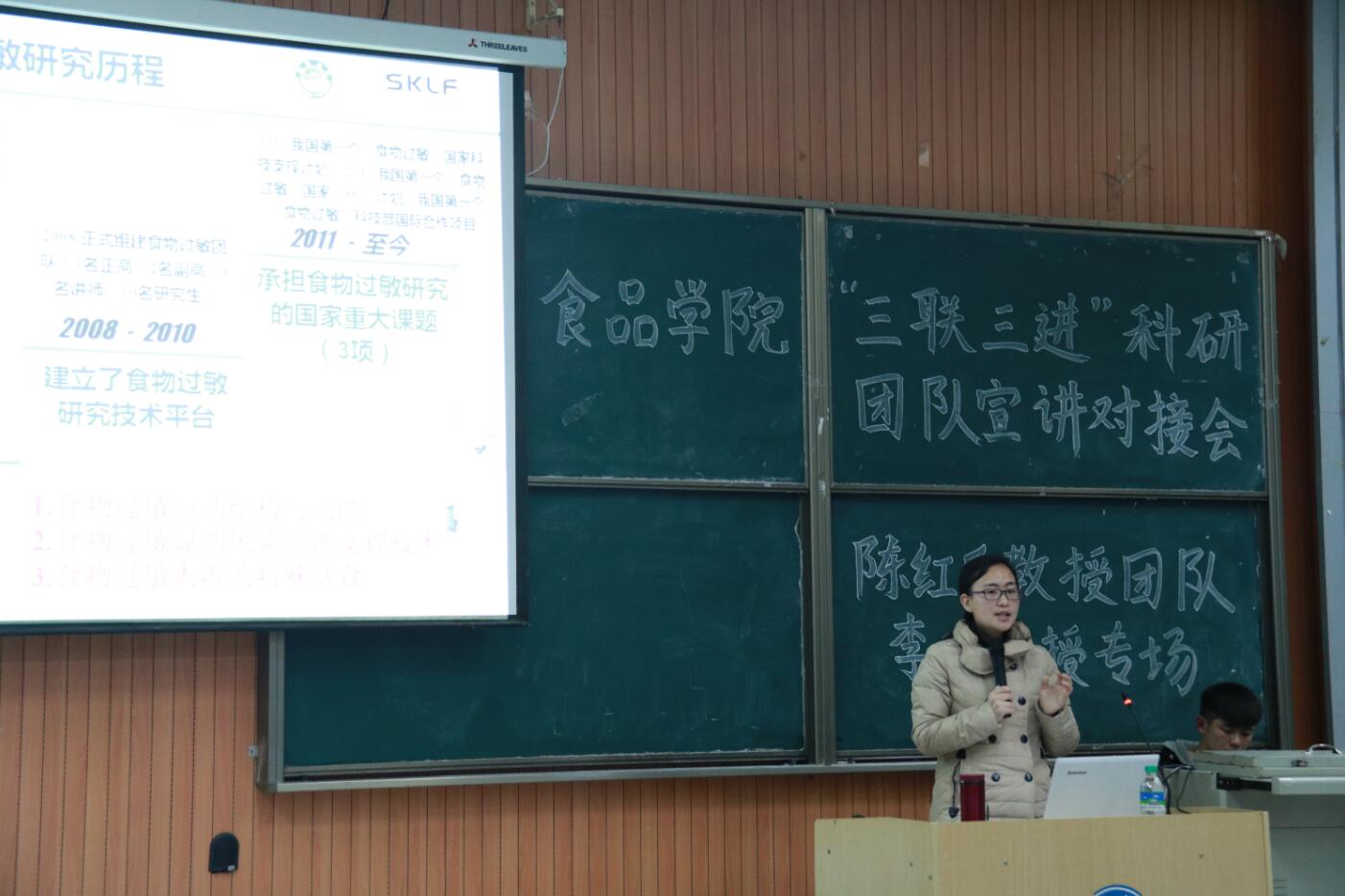 3月23日晚7点30分,食品学院于建工楼A506举办了“食品学院‘三联三进’科研团队宣讲对接会――陈红兵教授团队李欣老师专场活动”。宣讲会伊始,李欣老师考虑到大一同学专业知识尚有不足,便先详细的介绍了实验室的相关情况及其所在团队每个小组的研究方向。在场同学们对老师的研究方向兴趣十足,不仅在提问环节中积极发言,更当场就进行了报名。据统计,本次宣讲对接会共有120余名同学到场,当场共有57名同学报名陈红兵教授的团队。