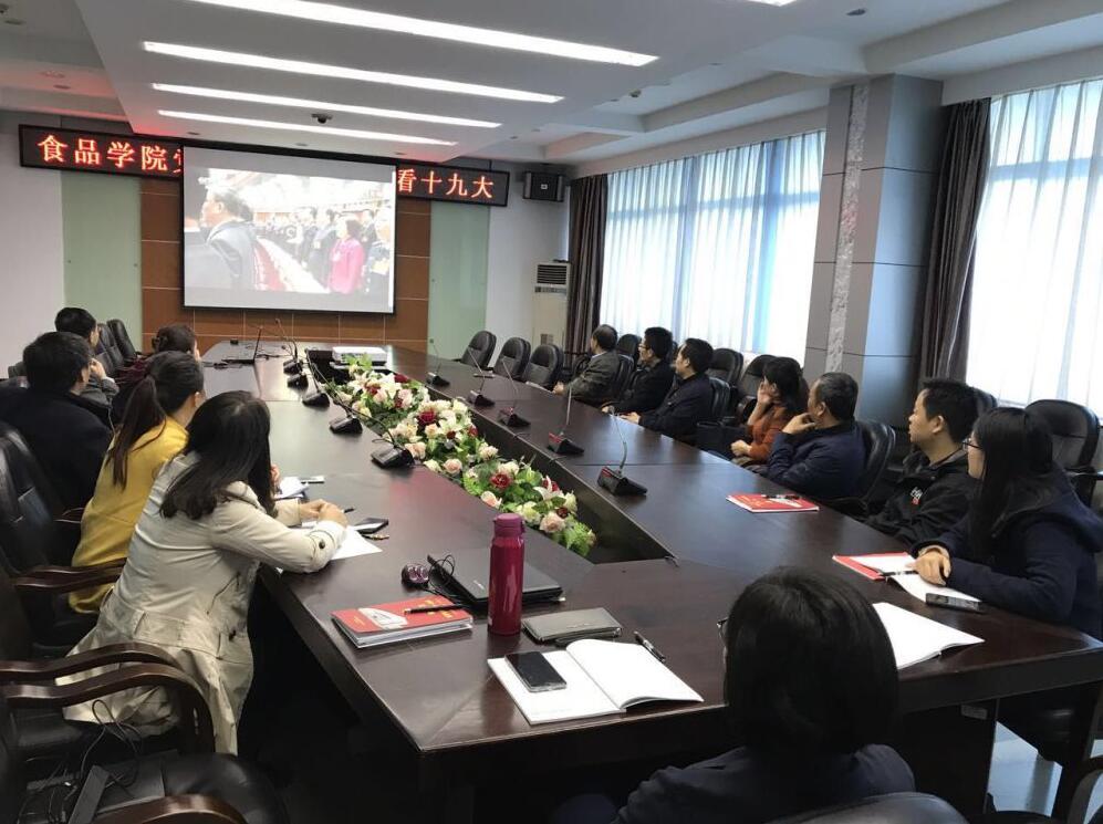 食品学院党委克服分列新老校区带来集中观看不便等困难,积极谋划、统筹协调,分别在青山湖校区食品科学与技术国家重点实验室201会议室、青山湖校区食品科学与技术国家重点实验室501会议室、中德食品工程中心会议室、中德联合研究院会议室、前湖校区理生楼学院会议室、前湖校区学生公寓1栋学院学生党员活动室等共设立 6处集中观看点,确保学院师生员工第一时间能在“家门口”集中观看学习十九大。同时,学院召开院党政联席(扩大)会议及全院教职工大会,传达学校迎接十九大各项会议精神和要求,布置学院相关工作。会议明确要求,要将学习观看十九大做为贯彻落实全面从严治党的重要体现,做为“两学一做”学习教育常态化制度化的重要内容,做为省委巡视反馈问题整改的重要工作,全体党员师生于十九大召开当天,佩戴党员徽章集体参加集中观看,不能参加的需请假说明事由,非党员也要求踊跃参加集中观看。十九大召开当天,全院师生均按照学院党委要求,积极参加了集中观看。其中,远在加拿大访学的师生党员也通过网络进行了观看。