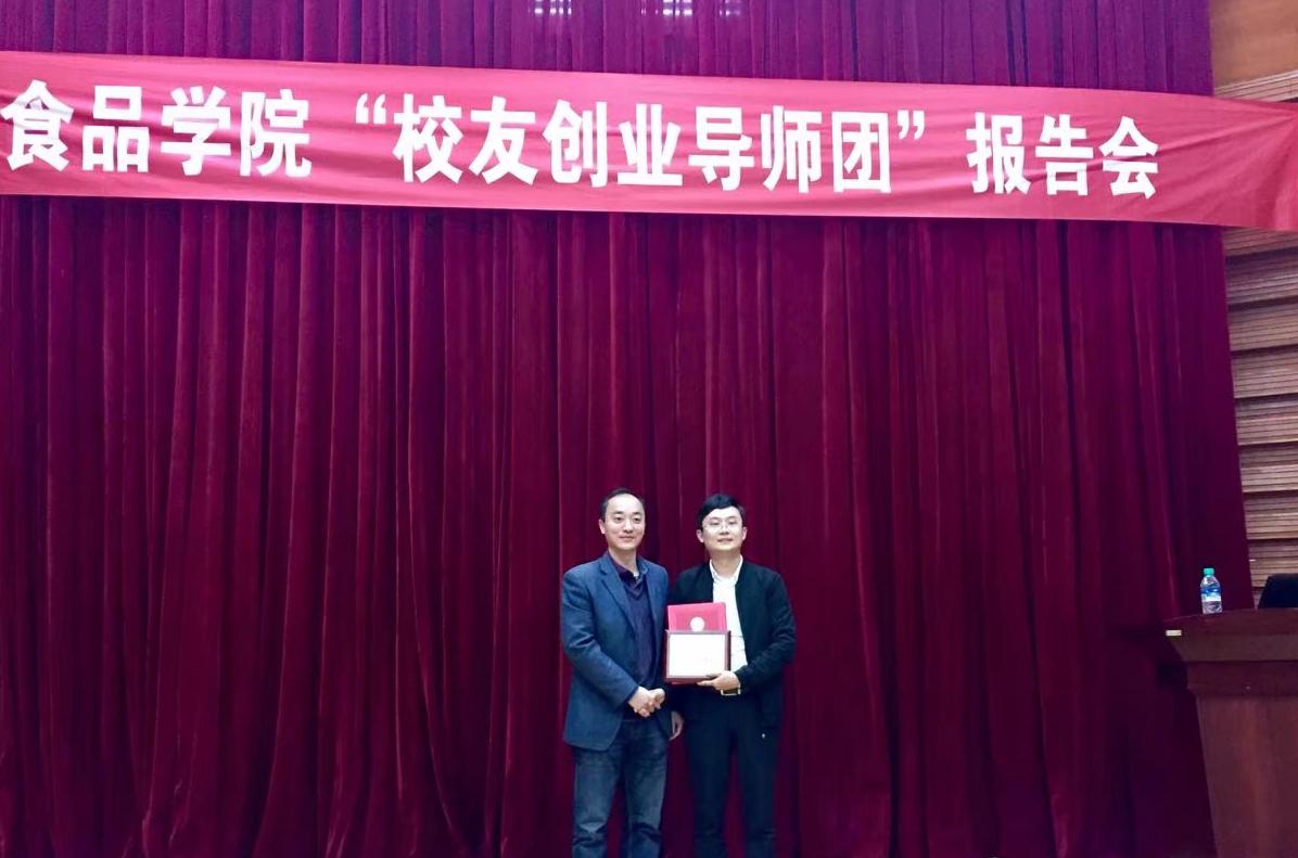 大会伊始,由党委副书记刘志凤向何涛颁发食品学院创业导师聘书以及纪念奖牌。