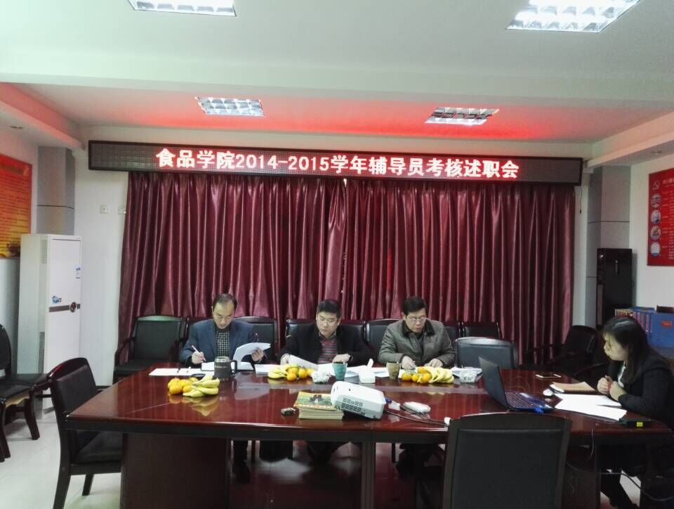(本院讯)为加强辅导员队伍建设,11月26日下午,学院开展了食品学院2014-2015学年辅导员考核述职,受学院党政委托,院行政副院长邹常春、院党政办主任叶反帝应邀出席。会议由院党委副书记刘志凤主持,院各年级辅导员进行述职。