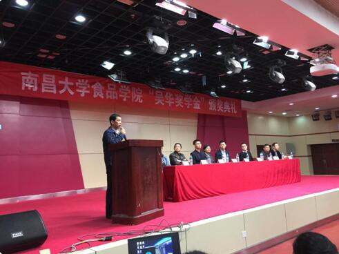 典礼伊始,由设奖人89级校友吴华率先致辞。他一开始就对食品专业的前景表示看好,“小专业,大行业”是他对食品的评价,衣食住行是我们生活的基础。随后,他又提出一个问题――我们能为这个社会做什么?从创业者和学生两个角度为我们解答了这个问题,分析了未来的产业发展、鼓励学生培养自己各方位能力,“学习很重要,但道德品质更加重要”,一番谏言获得了场下观众们的热烈掌声。最后,他表达了回到母校的感想:“每次回到学校,每次都有新感受。我每次都想带一些朋友来看看,希望能够对我们学校起到一些宣传推广作用。”感情之真挚令人动容。