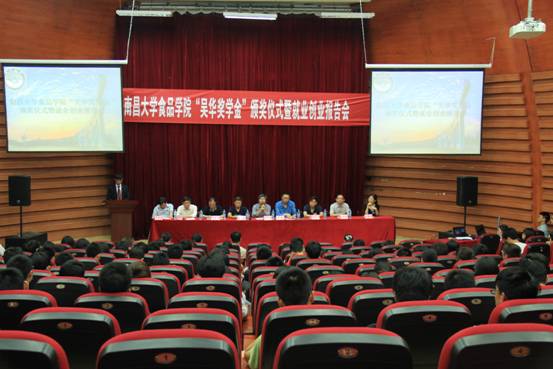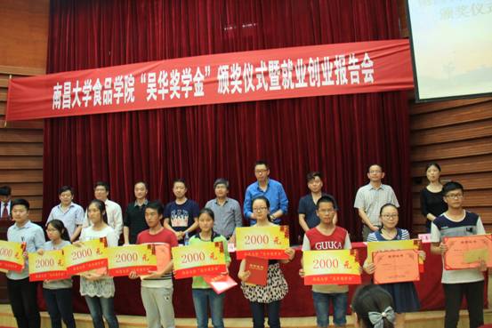2015年5月15日下午两点半,南昌大学食品学院“吴华奖学金”颁奖仪式暨就业创业报告会在理生楼报告厅举行。活动到场的嘉宾有我院89级优秀校友浙江桐乡嘉裕时装有限公司董事长吴华,浩悦地产集团任晓政董事长,富怡时装有限公司徐建兴董事长,食品学院院长刘成梅,第四临床医学院学生党总支书记艾淑平,食品学院党委副书记刘志凤、行政副院长邹常春、办公室主任叶反帝、副教授熊春红以及院学工办全体老师。