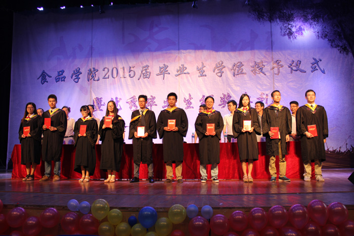 (食品学院 记者 万佳健)2015年6月23日下午2点半,食品学院2015届毕业生学位授予仪式暨优秀毕业生颁奖典礼在艺术楼音乐厅隆重举行。出席本次典礼的嘉宾有食品学院院长刘成梅,院党委书记谭杰,院党委副书记刘志凤,院行政副院长邹常春,食品科学与工程系副主任张国文,院教授委员会主任付桂明,院教授委员会成员熊华、徐尔尼、聂少平、刘伟。同时,学院相关职能科室的负责老师也参加了本次毕业典礼。