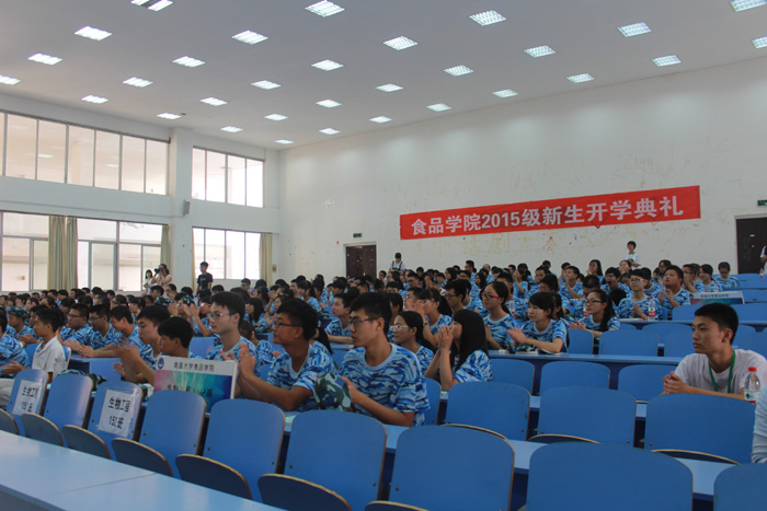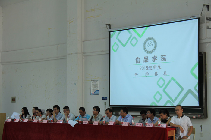 (食品学院学生会记者黄黎阳)金秋九月,硕果飘香,南昌大学食品学院又迎来了新一届来自五湖四海的莘莘学子。9月11日上午,我院举行2015级新生开学典礼暨专业导师见面会。院长刘成梅、院党委书记谭杰、院党委副书记刘志凤、副院长邹常春、副院长熊涛及院内各职能科室负责人、教师代表参加了此次开学典礼仪式。在庄严的国歌声中,典礼拉开帷幕。