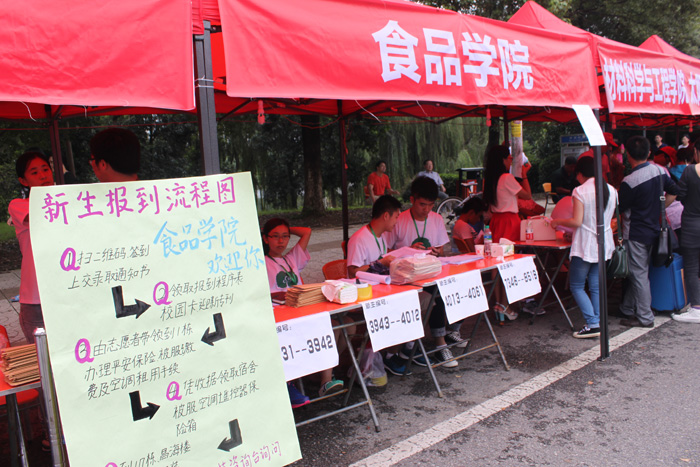 经过充分的准备工作,2014年9月3日11时,南昌大学食品学院的迎新工作正式开始。在迎新工作中,食品学院本着人性化的理念,对新生报到基本实行了一对一全程服务。迎新工作人员和志愿者们用热情的态度,积极的行动感染着每一位学生和家长。同时也让大家感受到了食品学院的团结友爱。每当有新生向食品学院的录入处走来,迎新工作人员都热情地接过行李物品,指引新生完成信息录入并引导他们去宿舍楼办理入住登记手续。