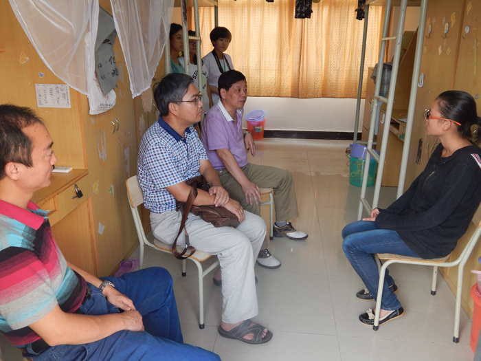 下午4点半,刘成梅院长一行人来到冯升燃同学的寝室。此时冯升燃正巧在打扫寝室卫生,院长的突然到访似乎令她有些手足无措,她急忙请问院长是否需要喝水,又忙着搬凳子请院长坐下。直到刘院长让她坐下,她依旧没有轻松下来,双手一直紧紧地握着。刘成梅院长环顾了寝室四周,关切地问冯升燃习不习惯宿舍的环境,适不适应大学的生活。在院长亲切的询问下,冯升燃起初的那份紧张与拘谨渐渐消失不见,开始放松地同院长交谈。