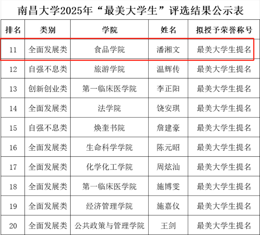 根据《关于开展南昌大学2025年“最美大学生”推选活动的通知》(南大学工函〔2025〕4号)要求,经学院推荐、社区展示、网络投票、材料评分、现场评选等环节,我院潘湘文南昌大学2025年“最美大学生提名”荣誉称号。