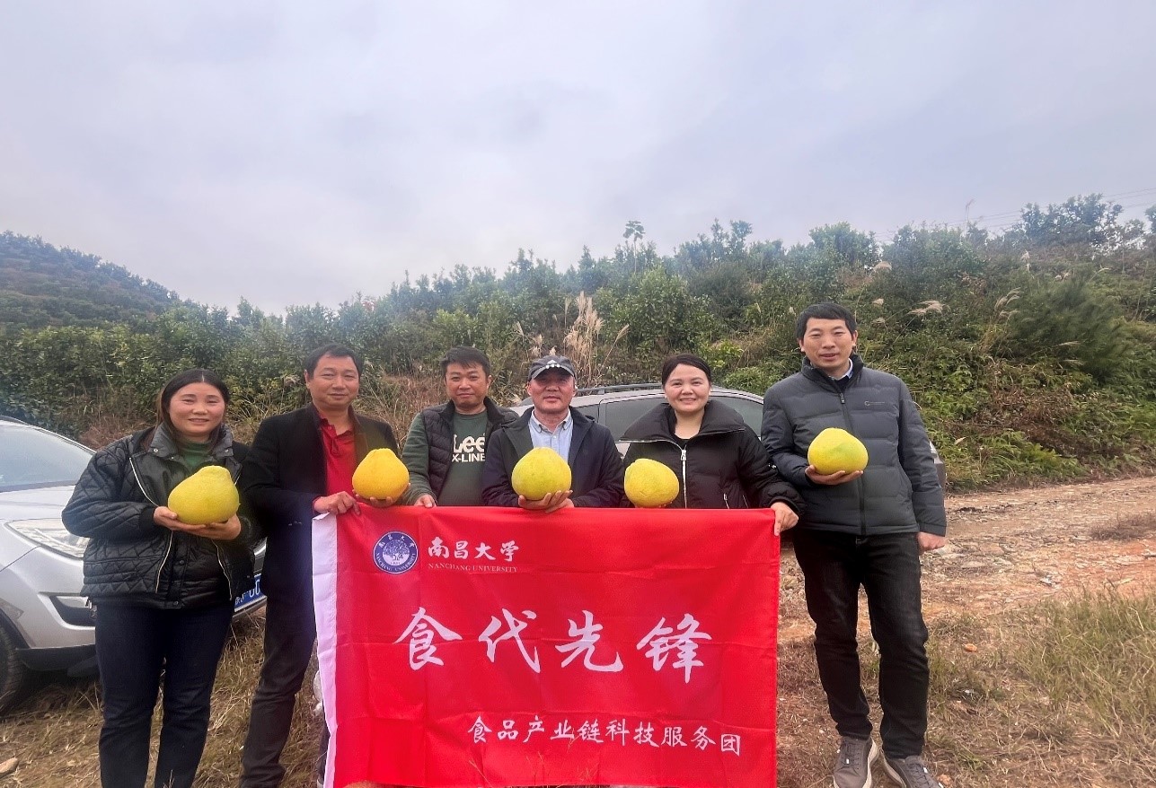 因去年胡兴副教授为柚子基地策划了防冻措施,使得新品种柚子树免受冻害,今年果实累累,服务团受基地负责人邀请,前往基地现场品鉴新品种柚子并为柚子基地做好了新一轮防冻规划,并将为新品种柚子的理化指标进行测定。此次科技服务充分发挥了南昌大学食品学科强项,对提升相关产业的科技含量、推动我省农业产业链高质量发展起到积极作用。