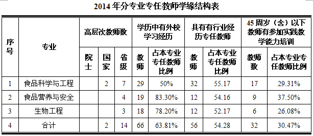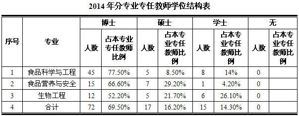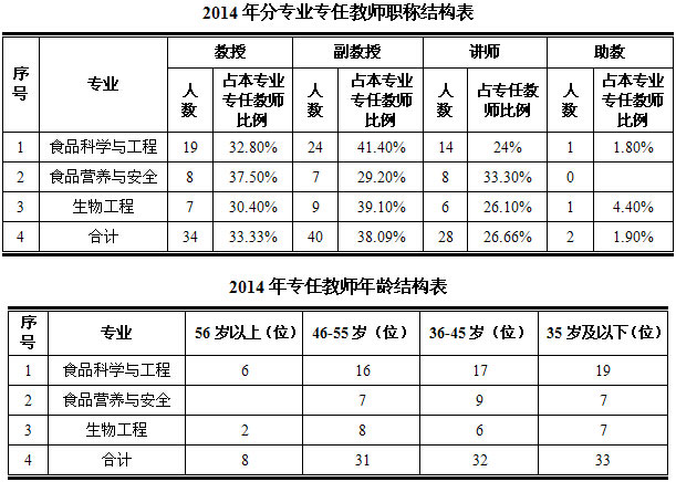 学科结构:专任教师中,各系根据学科发展布局教师队伍分布均匀,发展稳定。2014年食品科学与工程专业专任教师58人、食品质量与安全专任教师23人、生物工程专业专任教师23人。