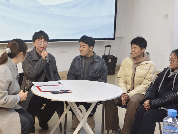 活动中,邱毓同学以本团队获奖的科创项目“敏日之星”为蓝本,进行了一场精彩的高质量模拟路演。演示中,他强调了如何在有限时间内抓住评委注意力,并从容应对技术细节提问与突发状况,生动演绎了从仪态管理到内容表达的竞赛展示全流程,为同学们提供了直观、鲜活的学习范例。活动尾声,圆桌会谈环节围绕“科研兴趣的发掘与培养”这一议题展开。四位学长学姐结合各自经历,展开了真诚而生动的分享。