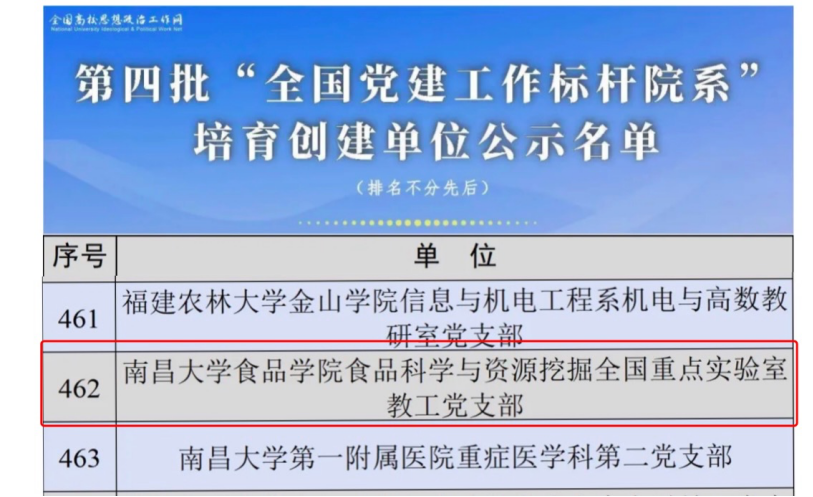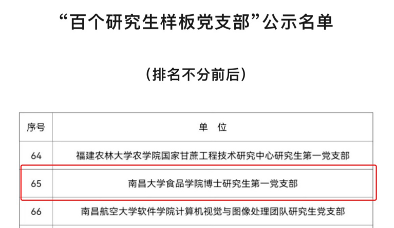 3月18日,教育部公示第四批新时代高校党建示范创建和质量创优工作遴选结果和第三批全国高校“百个研究生样板党支部”、“百名研究生党员标兵”遴选结果,我院在全国党建“双创”等党建项目上再创佳绩。食品科学与资源挖掘全国重点实验室教工党支部入选第四批“全国党建工作样板支部”培育创建单位、博士研究生第一党支部入选第三批全国高校“百个研究生样板党支部”。至此,食品学院已成功入选1个“全国党建工作样板支部”,2个“百个研究生样板党支部”。