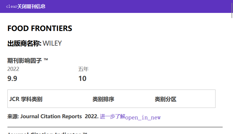 近日,信息服务提供商科睿唯安发布了2023年度《期刊引证报告》(下称“JCR”),该年度报告是全球具有影响力的期刊评估资源,提供包括期刊影响因子、分区、引用频次等在内的多种年度期刊度量指标,也是目前国际上通用的期刊评价指标。该报告通过一系列指标对全球2万多本来自五大洲80多个国家和地区的高质量的科技学术期刊进行评估,涵盖自然科学和社会科学200多个研究领域。其中,期刊Food Frontiers的影响因子(Journal Impact Factor)为9.9,而五年影响因子更是高达10.0。