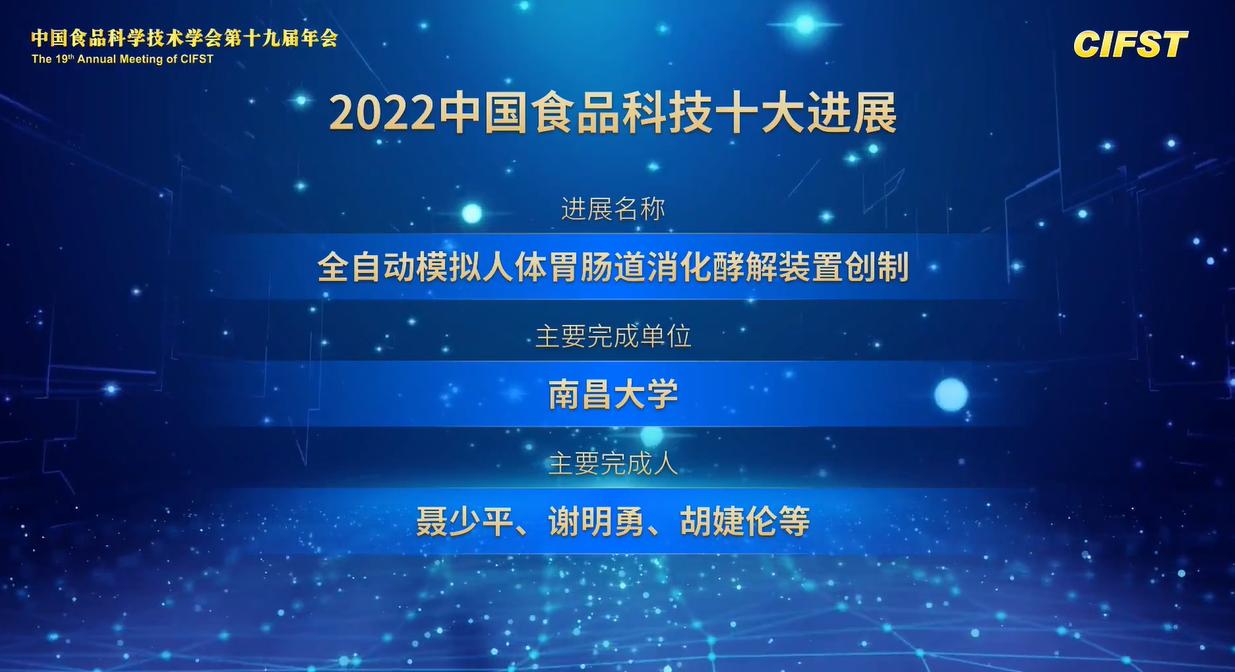 聂少平团队创制的全自动模拟人体胃肠道消化酵解装置入选“2022中国食品科技十大进展”,是我校食品学科科技创新的最新成果,也是我校科研成果实现原始创新的重要突破。