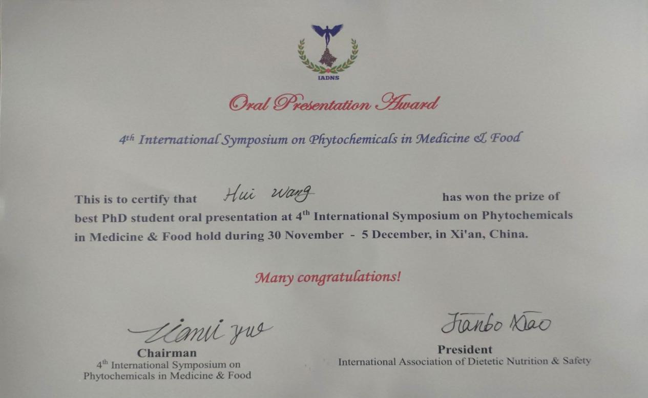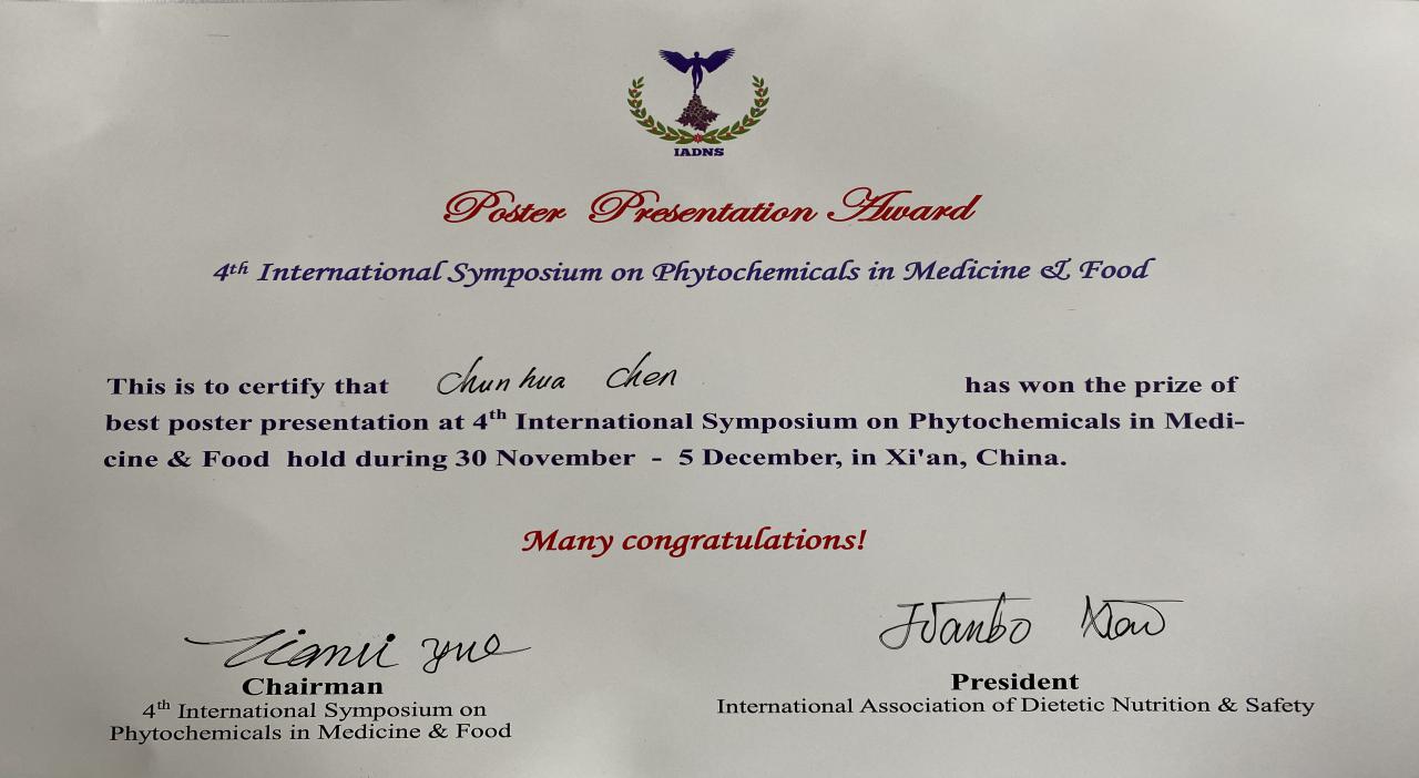 本届会议邀请来自全球67个国家和地区的食品科学与天然产物研究领域专家 (其中国外270余人、国内近400人、中国港澳台地区30余人)参会,以线上会议与线下会议相结合同时开展学术交流,线下会议主要有大会报告、研究生论坛和墙报等。我院院长聂少平教授、副院长殷军艺研究员参加了会议并分别进行了报告,学院师生代表共10余人参加了此次盛会。其中博士研究生王辉参加了博士研究生论坛并获得最佳博士论坛奖(最佳口头报告仅评选4人),硕士研究生陈春华进行了海报展示并获得最佳海报奖(最佳墙报仅评选8人)。